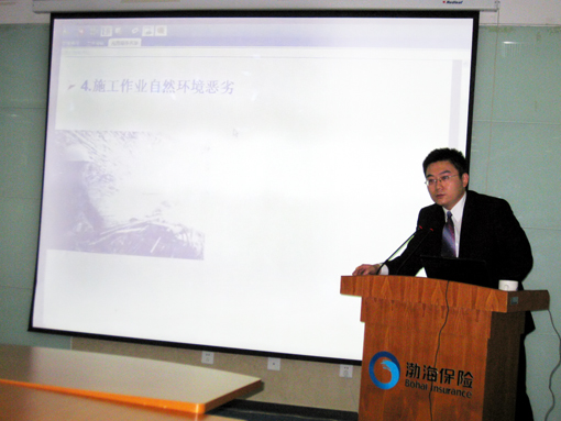 本次培训的主题是《建筑业意外伤害与保险》,培训内容分为建筑业的分类和特点、建筑业的安全生产形势与 现状、建筑安全风险因素分析、建筑业意外伤害保险实践和案例分析等五个方面进行了详细的介绍与讲解。渤海财产保险公司对此次再保险培训服务给予了高度重 视,其总公司财产保险部、意外健康险部与天津分公司的同事现场参与了培训,全国25家外地分支公司通过视频的形式参与了培训。