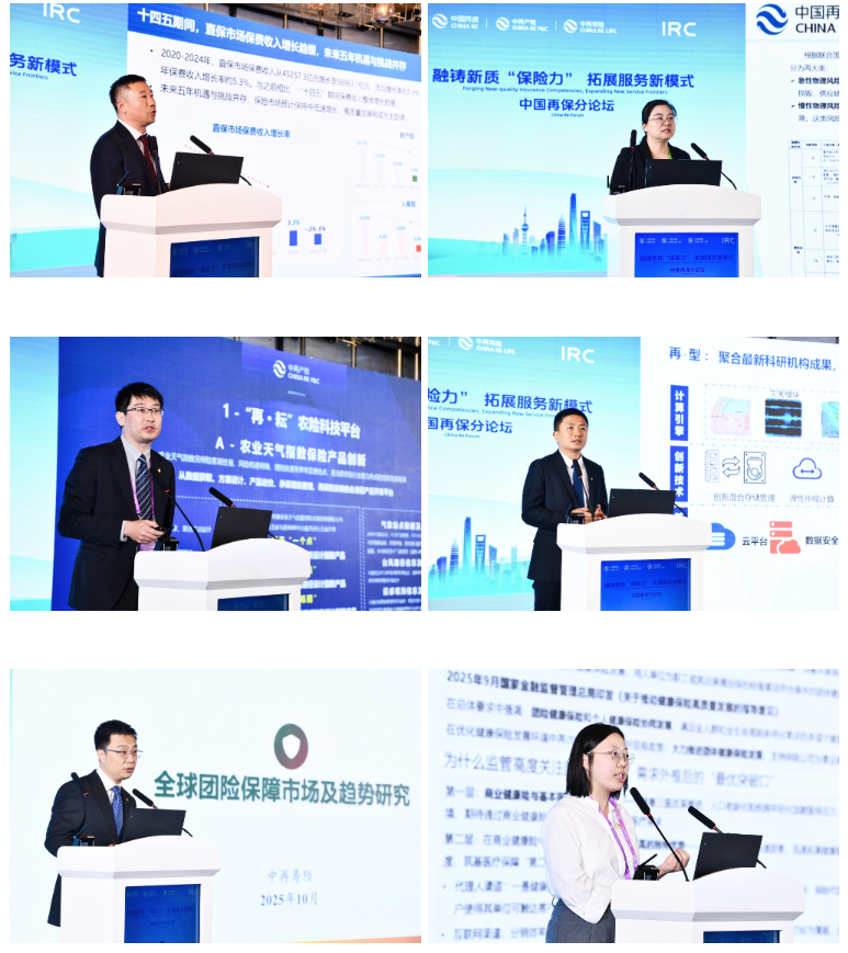 专题研究报告板块,中国再保气候风险研究中心主任袁曦介绍了中国再保气候风险压力测试平台,分享了平台的建设思路与应用案例。中再产险业务发展与管理部副总经理孙涛、中再巨灾市场开发部负责人翟亮亮介绍了“再”系列平台赋能新质“保险力”的成果,详细阐述了“再”系列平台在农业保险、新能源车险、网络安全保险等领域的应用。中再寿险战略研究部总经理助理金笑权通过美、英、加、法四国团险市场对比,介绍了“团险发展国际路径”,为行业在团险领域的优化升级提出发展路径建议。中再寿险产品开发部李鸾介绍了“再健康”生态平台,分享了中再寿险推动团体产品转型升级的实践经验。